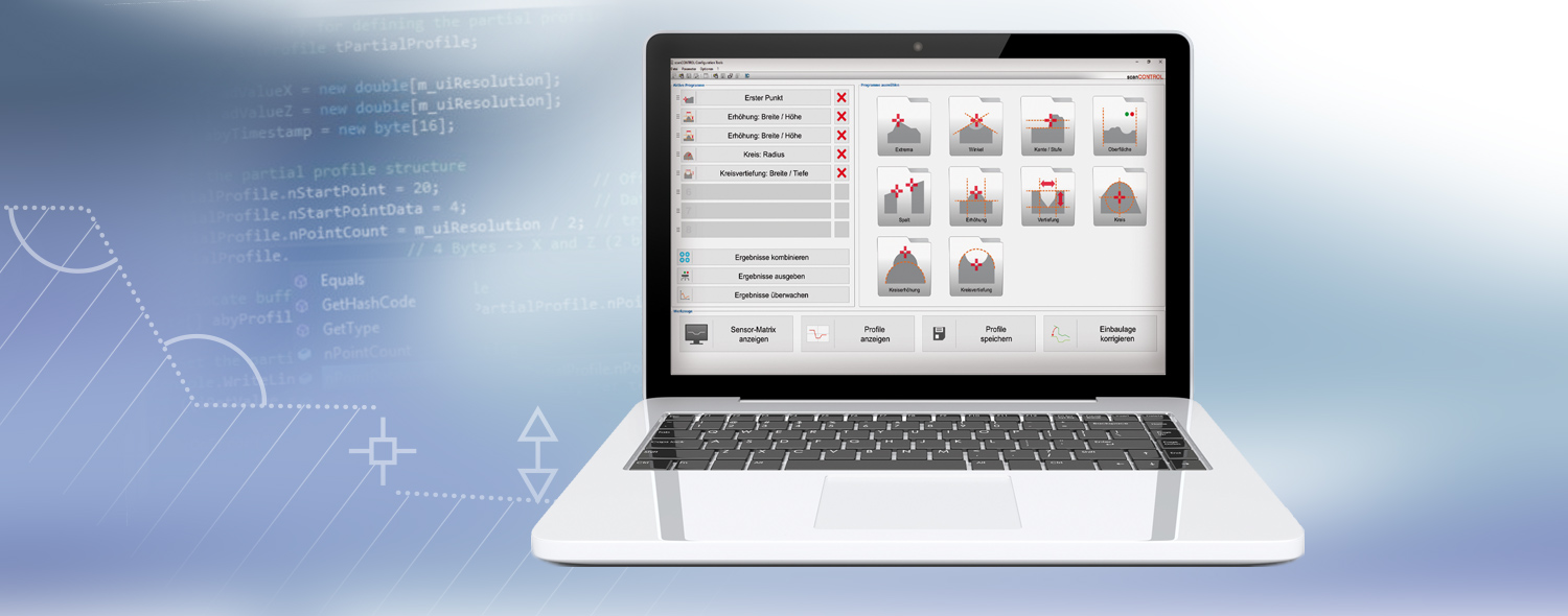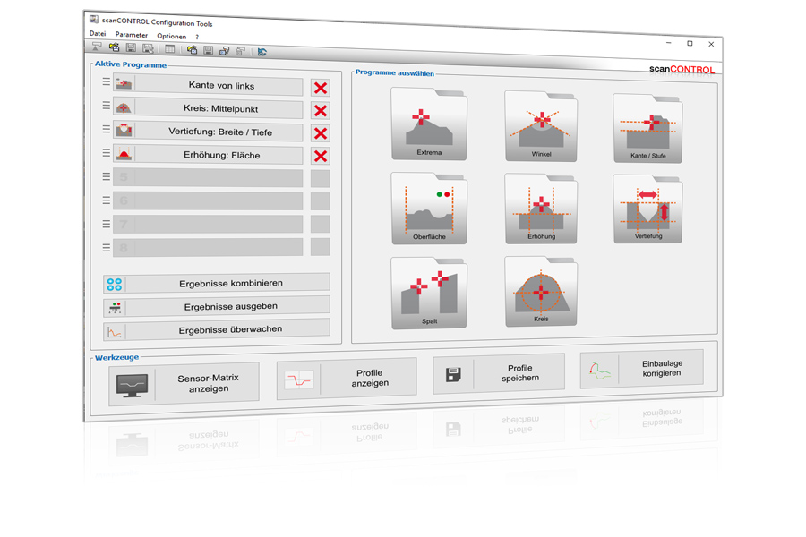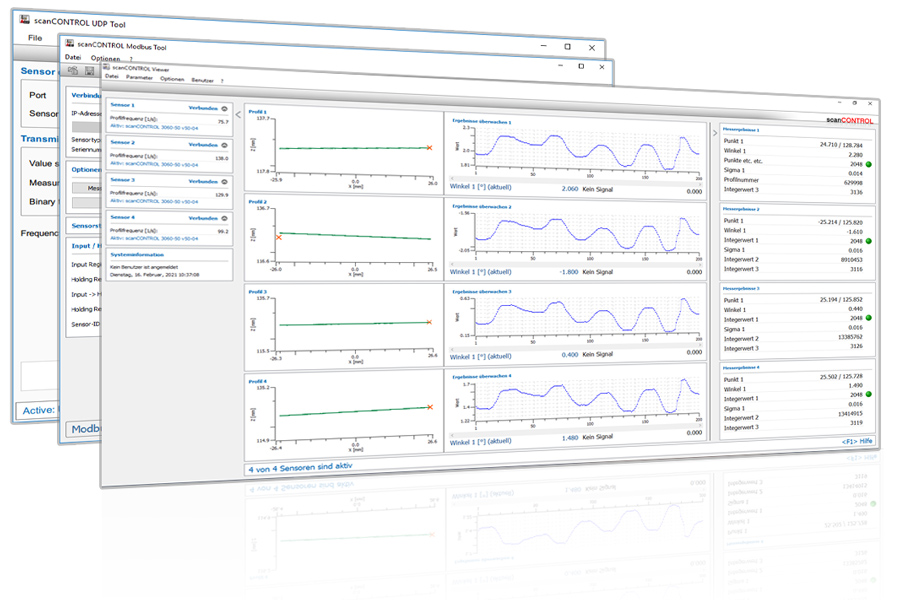 Für die Laser-Profil-Scanner stehen spezielle Anwendungen zur Sensorkonfiguration, Datenanzeige und -ausgabe zur Verfügung. Die Software ist für jede Produktfamilie kostenlos erhältlich.