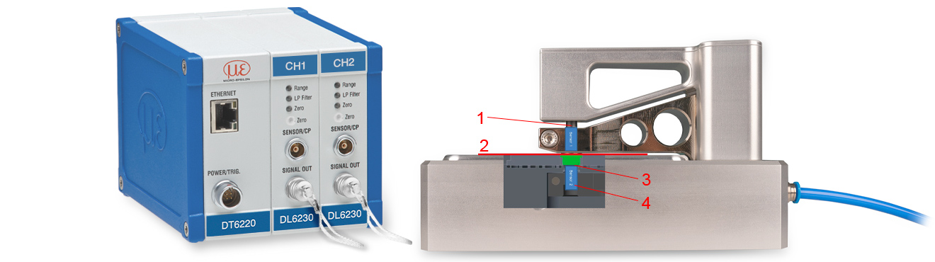Der fest eingebaute kapazitive Sensor (1) im oberen Bereich des Messbügels misst den Abstand zum Messobjekt (2). Der Messeinsatz (3) ermöglicht eine Referenzierfläche, über die das Messobjekt mittels Vakuum angesaugt und darüber gespannt wird. Der kapazitive Sensor im unteren Bereich (4) misst auf den Messeinsatz und kompensiert den mechanischen Versatz der Auflagefläche.