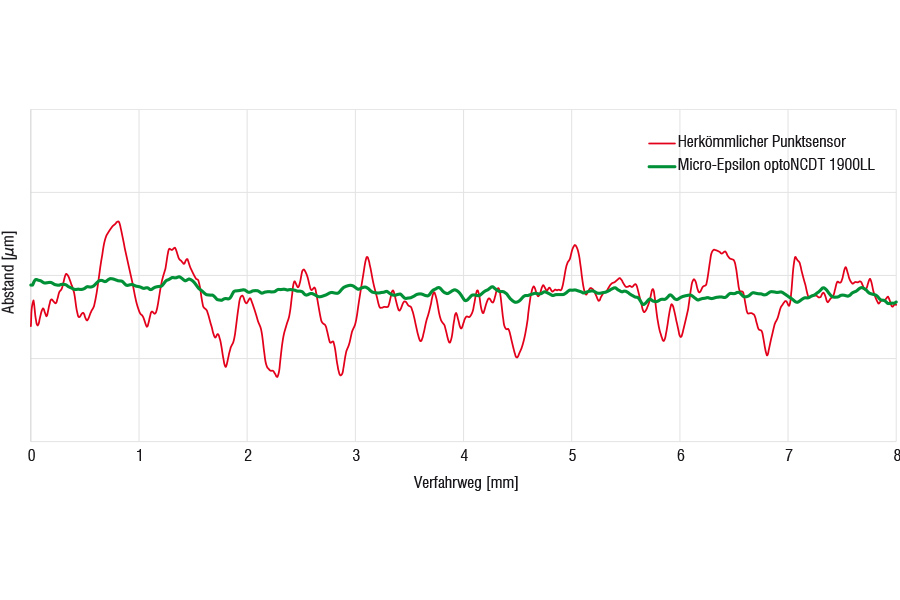 Die Lasersensoren der optoNCDT LL Serie erzeugen einen ovalen Lichtfleck von nur wenigen Millimetern Breite, der einer kurzen »Laserlinie« ähnelt. Der ovale Lichtfleck kompensiert inhomogene Oberflächenstrukturen sowie das sogenannte „Speckling“, das insbesondere bei metallischen Oberflächen auftritt. Im Zusammenspiel mit speziellen Software-Algorithmen werden Störungen durch Oberflächenrauigkeiten, Defekte, Vertiefungen oder kleinsten Löchern ausgefiltert. Dadurch werden stabile und präzise Messergebnisse erzielt.