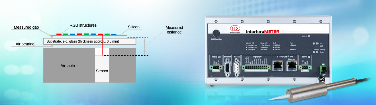 Aus Qualitätsgründen muss der Abstand zum Substrat stets exakt gleich bleiben. Da das Substrat auf einem Lufttisch aufliegt und daher schwanken kann, wird dessen Abstand zum Tisch von mehreren Interferometern ermittelt. Mit der Multi-Peak-Option lassen sich zugleich der Spalt zwischen dem Substrat und die darauf befindliche Siliziumschicht prüfen. Der äußerst kleine und vakuumtaugliche Sensor IMP DS1/VAC ist direkt im Lufttisch verbaut und misst von unten auf bzw. durch das etwa 0,5 mm dicke Glas. Die Messwerte werden direkt über EtherCAT an die Steuerung der Maschine übermittelt und dort zur Regelung der Druckluft verwendet.