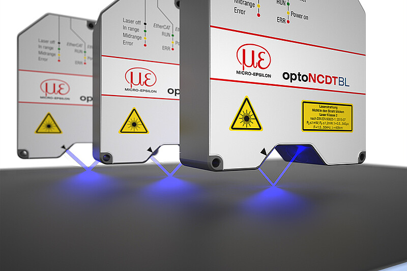 Antireflexbeschichtetes Glas wird im Beschichtungsprozess mit laseroptischen Wegsensoren von Micro-Epsilon geprüft, um Unregelmäßigkeiten wie Welligkeit oder Verwindung festzustellen. Dabei wird in mehreren Messspuren die Planarität der beschichteten Glasoberfläche gemessen. Dank der patentierten Blue Laser Technologie liefern die optoNCDT 2300-2DR Sensoren eine hohe Messgenauigkeit auf den beschichteten Glasflächen.
