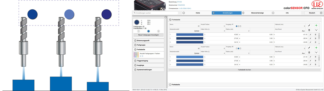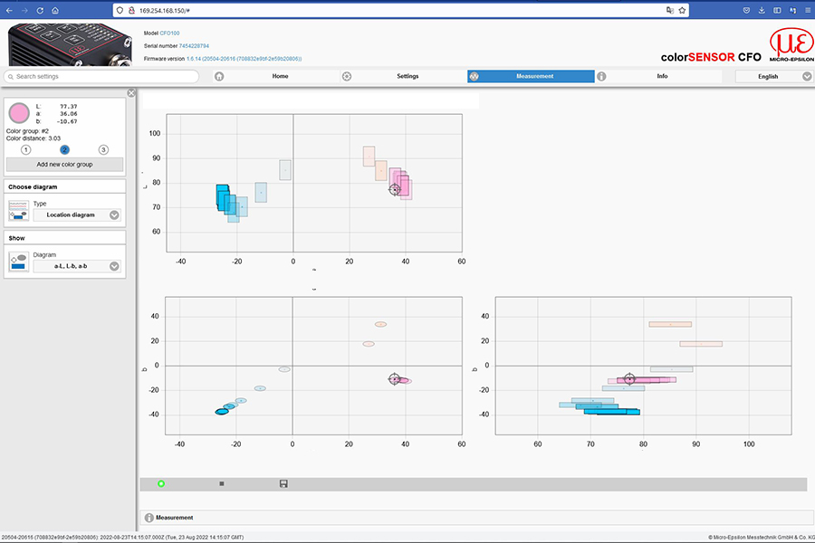 Die gesamte Konfiguration des CFO Systems erfolgt komfortabel und intuitiv über das integrierte Webinterface. Dazu wird der Sensor über die Ethernet-Schnittstelle mit einem PC verbunden. Das Webinterface ermöglicht die Messwertanzeige und das Einstellen von Parametern wie der Belichtung oder der Messfrequenz. Darüber hinaus lassen sich Anpassungen für Farbgruppen vornehmen und Toleranzräume für jede Farbe definieren.