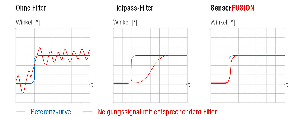 Zur Stabilisation des Messsignals in dynamischen Anwendungen verwenden die Sensoren einen 3D-Beschleunigungssensor mit 3D-Gyroskop und integriertem Fusionsfilter. Intelligente Algorithmen sorgen für eine genaue Messung während der Bewegung. Äußere Einflüsse wie Stöße, Fliehkräfte oder Vibrationen z.B. durch Bremsvorgänge, Drehbewegungen, Steinschläge oder Motorenvibration nehmen keinen Einfluss auf die Messung.