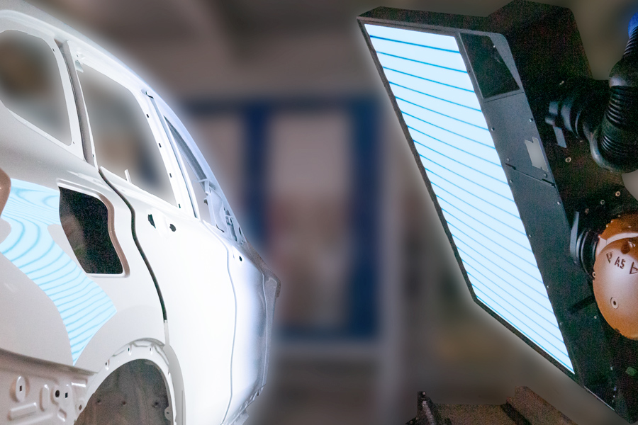 Das Inspektionssystem erreicht eine überragende Flächenabdeckung und detektiert Fehler bis <1 mm zum Rand. Die Messung kann auch an Designkanten erfolgen und wird flexibel an den Öffnungswinkel beweglichen Bauteile wie Türen und Klappen angepasst.