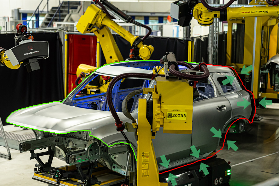 Das Messsystem surfaceCONTROL Automotive wird zur vollautomatischen Defekterkennung auf Roh-Karosserien eingesetzt. Dieses System nutzt das Prinzip der Streifenlichtprojektion auf diffus reflektierenden Oberflächen und erkennt mithilfe lernender Verfahren lokale Formfehler wie Druckstellen, Risse und Einfallstellen mit hoher Präzision und Reproduzierbarkeit.