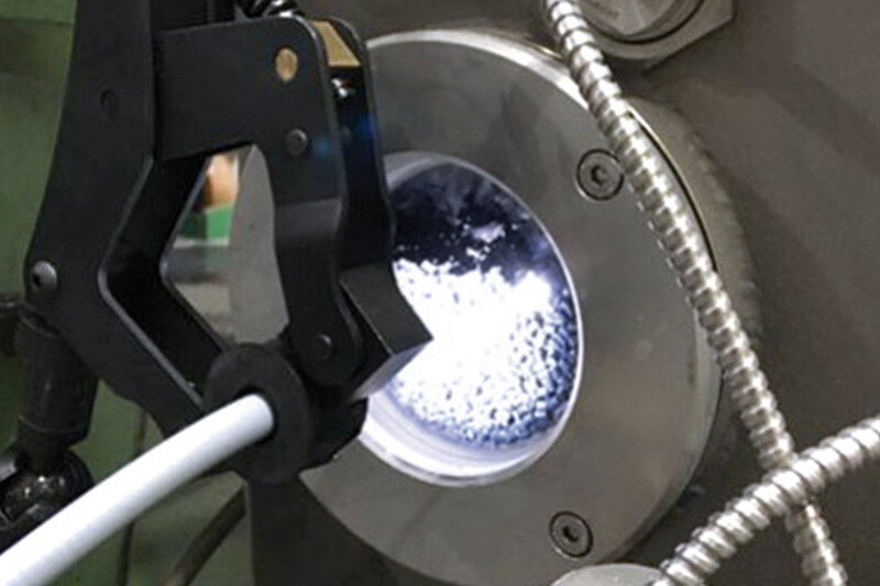 A True Color sensor from the colorSENSOR CFO200 series by Micro-Epsilon is used to detect the fluctuating color values of the pellets. The sensor measures the color of the pellets through a sight glass in the suction box of the finished product conveyor and reliably detects the smallest color deviations (∆E < 1) from the programmed reference value.