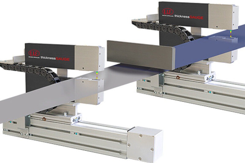 Two synchronized thicknessGAUGE systems are used for precise thickness measurement in coating processes. One system records the strip thickness before coating and one system monitors the thickness after the coating is applied. The coating thickness is determined from the difference between the two measured values and transferred to the system controller. The systems are equipped with confocal sensors that achieve high measurement accuracy independent of the surface reflection.