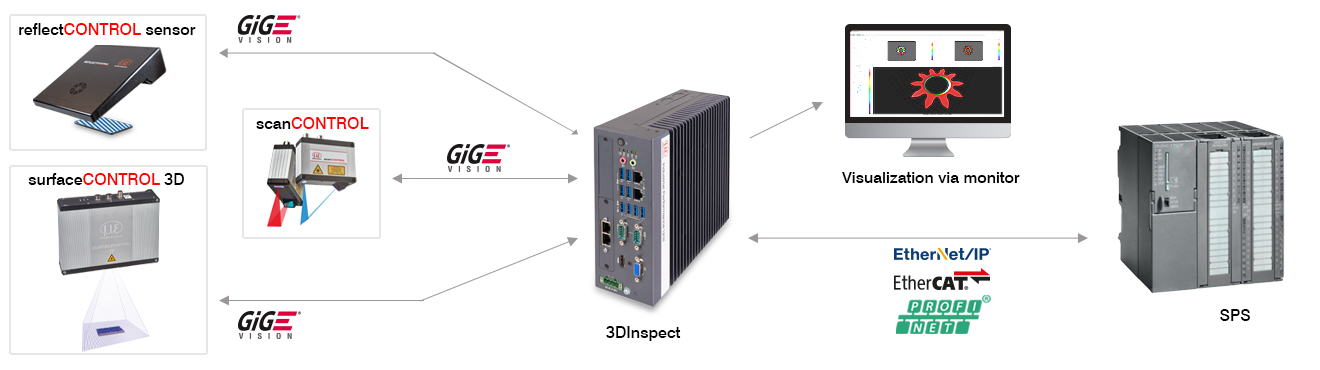 3DInspect on yhtenäinen ja käyttäjäystävällinen ohjelmistotyökalu, joka on suunniteltu kaikille Micro-Epsilonin 3D-antureille. 3D-antureiden parametrien määritykset ja mittaustietojen tallentaminen tehdään suoraan 3DInspect-ohjelmistossa. Tehokkaat työkalut mahdollistavat pistepilven kohdistuksen ja suodatuksen, intuitiivisen tunnistamisen ja asiaankuuluvien alueiden sekä ohjelmayhdistelmän valitsemisen. 3D-pistepilvet voidaan käsitellä tarpeen mukaan, ja mitatut arvot voidaan siirtää suoraan ohjaimeen.