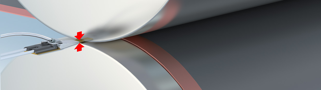 La mesure de l'écartement est réalisée directement sur le rouleau à l'aide d'un capteur plat intégré d'une épaisseur de 0,9 mm seulement. Le capteur capacitif réalise des mesures de chaque côté. Il détecte ainsi deux écartements entre les rouleaux supérieurs et inférieurs. L’écartement des rouleaux est régulé pendant le fonctionnement en fonction des valeurs de mesure. La structure stable en température permet une utilisation même à des températures ambiantes élevées. Un dispositif de soufflage est intégré pour protéger le capteur des dépôts de poussière.