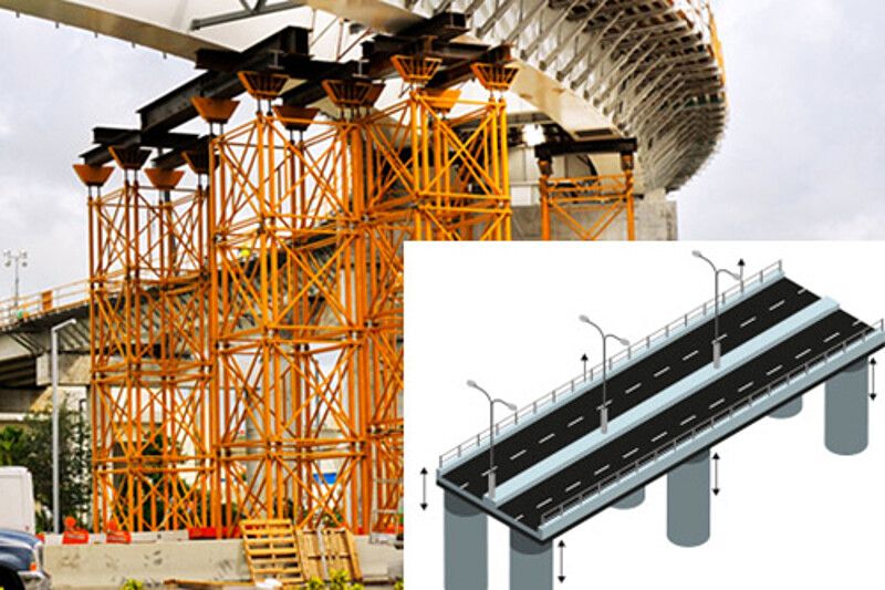 The supports on bridges must be renewed from time to time. The supports bear the weight of the bridge superstructure and absorb vibrations and expansions of the bridge. As the properties of the rubber bearings change over time, they must be replaced regularly. For such maintenance work, the bridge piers are lifted by 10 to 15 mm with heavy-duty lifters. After the maintenance work has been completed, the superstructure is lowered onto the new supports. When lifting bridges, it is important that the lifting process is absolutely synchronous so that no torsion forces can act on the bridge. Therefore, a string potentiometer is integrated in each heavy-duty lifter, which reports the current stroke to the control system.