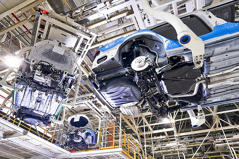 ボディシェルから車ができあがる前に、ボディシェルはその製造過程で完全オートメーションによる処理が施されていく数多くのステーションを通過します。処理ロボットがボディの正確な位置を検知できるように、複数のレーザー三角測量センサがボディへの距離を測定し、位置データをロボット制御に伝達します。
