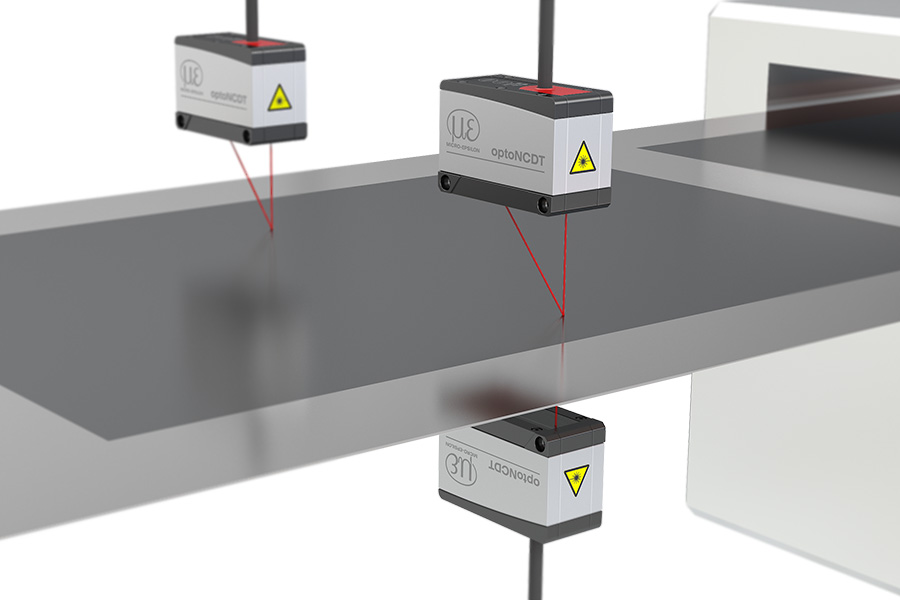 測定対象物の両側に配置されたレーザー変位センサーが、差分厚さ測定法でさまざまな対象物の厚さを検出します。非接触式厚さ測定は、プラスチック、金属、木材、コーティングされたガラスなど、多様な材料に対応できます。正確な測定結果を得るには、対向配置されたセンサーを同期させて精密に調整する必要があります。測定範囲に応じて、センサー間の距離を大きくして配置することも可能です。