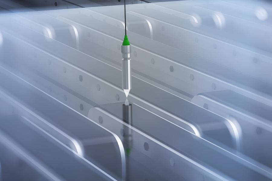 導電性物質の超高精度厚さ測定には、対向配置された静電容量式距離センサーが使用できます。インテリジェントコントローラーがセンサー信号の処理と計算を行い、厚さ測定値を直接出力します。両面厚さ測定により、シリコンウェーハやコーティングされたバッテリーフィルムといった非常に薄い測定対象物の厚さでも、高精度かつ安定して測定することができます。