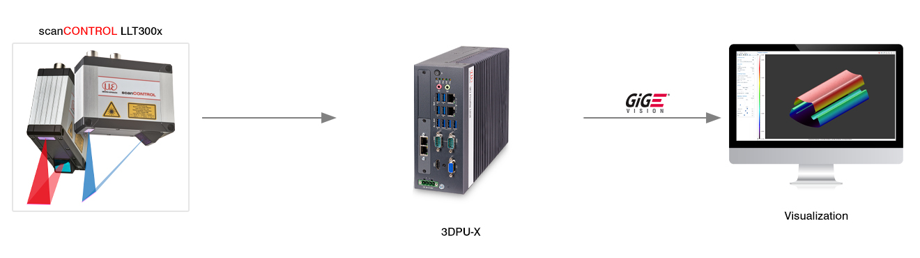 데이터 평가 및 시스템 파라미터 설정은 3DInspect 소프트웨어에서 수행할 수 있습니다. 3D 프로파일 유닛 컨트롤러는 산업용 Ethernet 연결과 결합된 내장 평가 기능을 통해 응용 프로그램을 제어하고 측정값을 PLC로 출력할 수 있습니다. 또는, 3D 프로파일 유닛 컨트롤러는 GigE Vision을 통해 일반적인 영상 처리 프로그램에 통합될 수 있으며 로우 데이터 (Raw data) 공급자의 역할을 수행할 수도 있습니다.