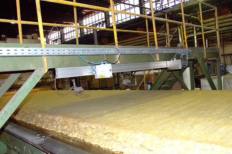 In addition to the homogeneous material structure, thickness is a quality feature for maintaining the insulating properties of mineral wool. At the end of the production line, the webs are trimmed and milled to standard thickness. To optimize the production effort and to reduce waste, the material thickness is measured on two tracks before the milling cutter. This allows the pre-thickness to be optimized without affecting the final result. Two optoNCDT laser sensors are used for thickness measurement. If larger distances have to be maintained for safety reasons, optoNCDT ILR2250 laser distance sensors are used. The thickness is calculated based on the distance from the mineral wool to the sensor and the support. The measured data is then transferred to the control system.