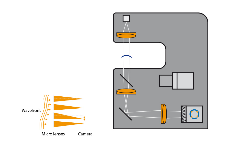 Optocraft社の計測システムでは高いダイナミックレンジのシャックハルトマンセンサにより、内部光学系を駆動させる必要がありません。すべて固定された光学系のもと、すべての計測は終了されます。その為、高速で高精度の計測を実現します。レンズの特性計測はシャックハルトマンセンサで計測を行い、外観検査は高精細の産業カメラが使用されます。両方のカメラは同軸上に配置され、同時に計測が行われます。キズ検査の用途には明視野・暗視野・テレセントリックに光源が瞬時に切り替えられるので、レンズ特性、外観検査等すべての計測は1秒をかけずに終了されます。